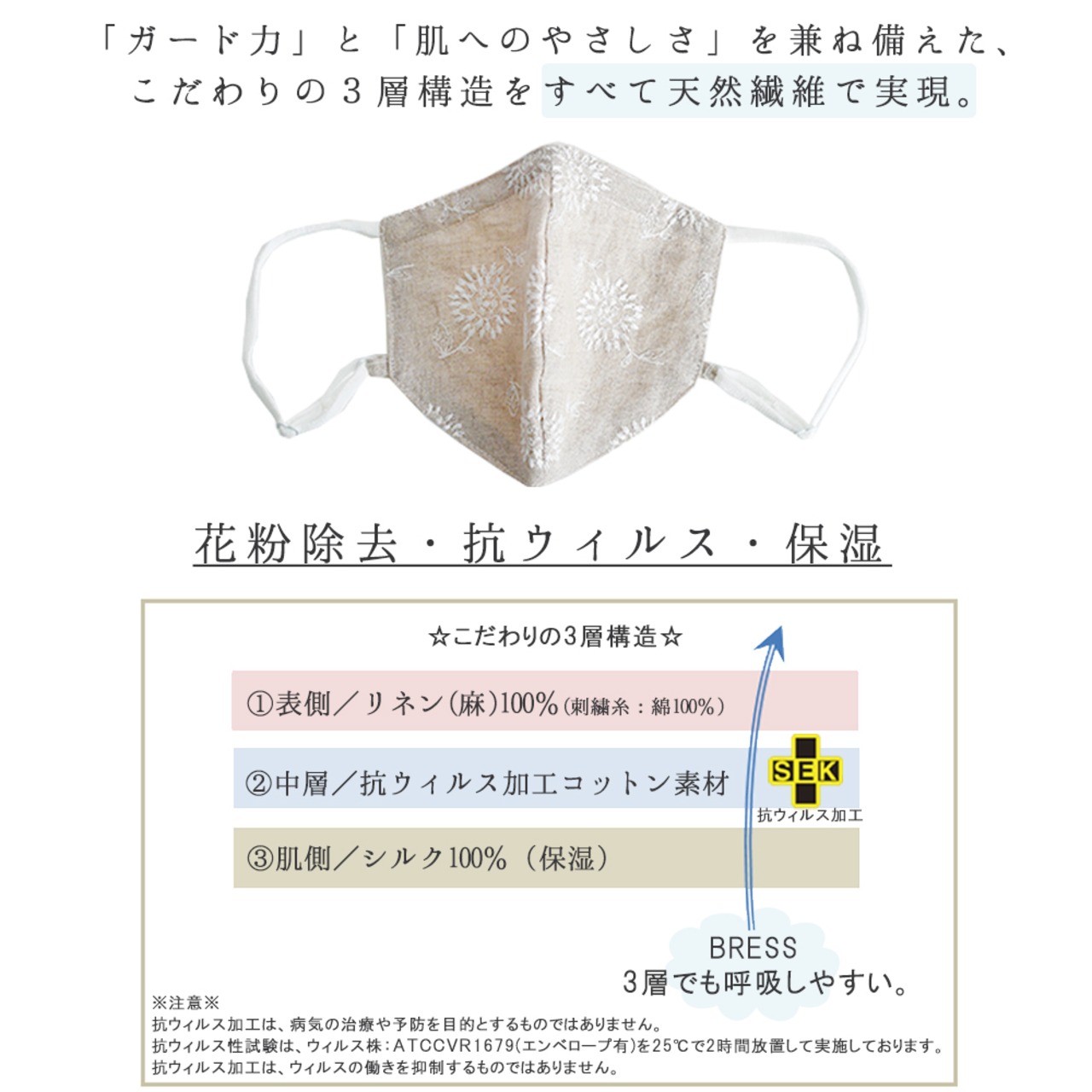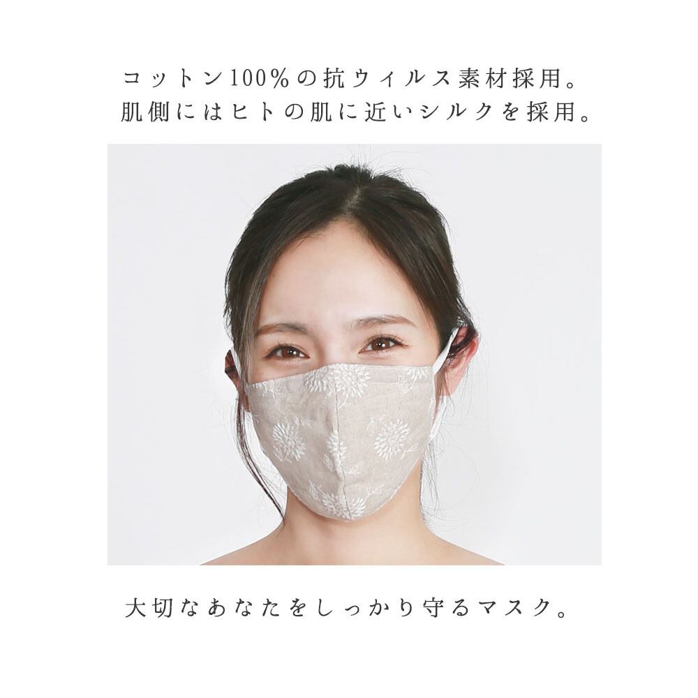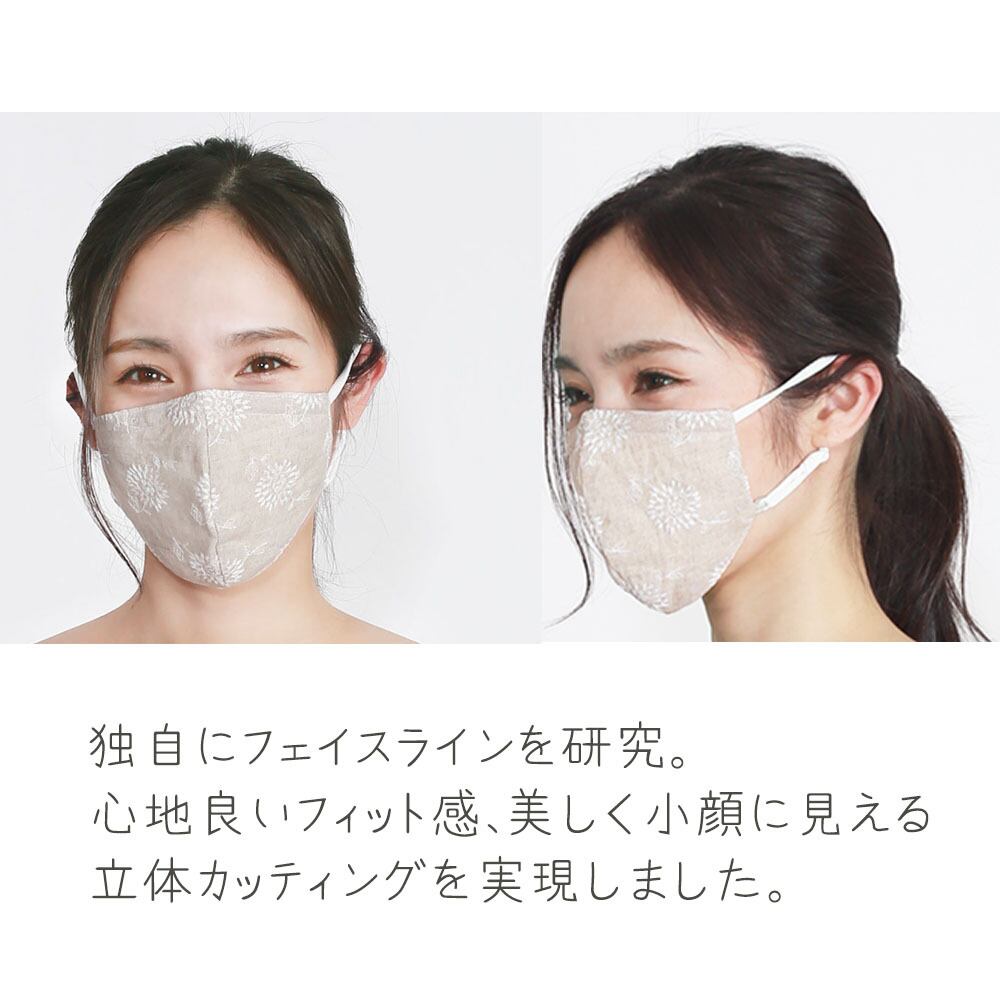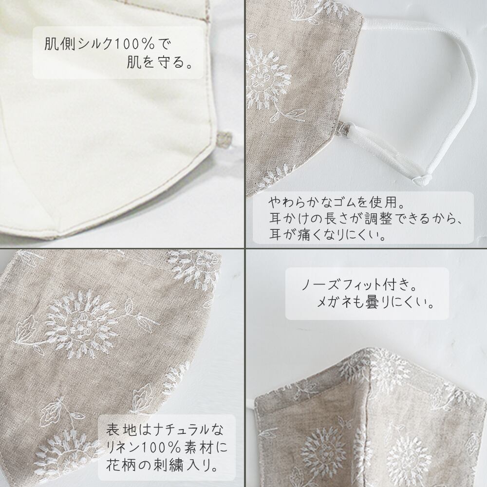 表側にナチュラルなリネン(麻)100%素材に、可愛い花柄の刺繍生地を使用し、ファッション感覚で楽しめるマスクに。
